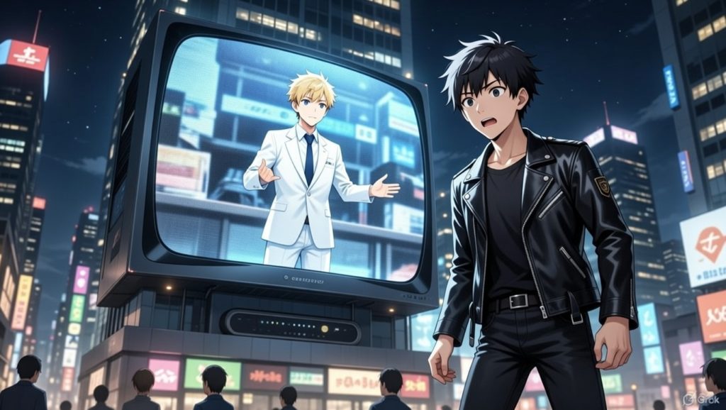 ミーコ、ユミと行動を共にする明くん…そこで大きなビルとかにくっついている、通行人とかが自由に見れる、渋谷のスクランブル交差点とかにありそうな大型テレビで、飛鳥了の放送を観ます