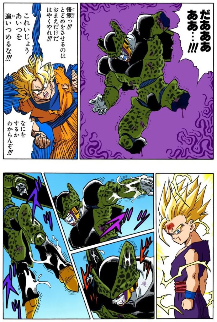 悟空と戦ってセルもまぁまぁ消耗していましたので、悟飯もベジータトランクス以上には強く、蹴りでセルに尻もちをつかせる場面もありました。途中ベジトラも乱入し、下手に追い詰めて自爆でもされたら大変です