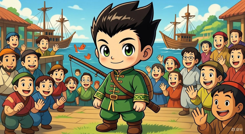 ゴンが釣り竿で巨大な魚を釣り上げます!(ドラゴンボールも悟空の魚釣りから始まるので、ここは富樫先生の鳥山先生のリスペクトを感じさせますね!)