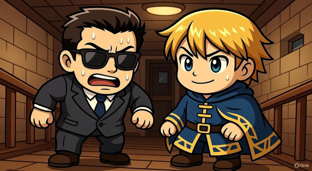 そこでボロボロな男が出てきます「ウソだ!その男はウソをついている!オレが本物の試験官だ!」という男