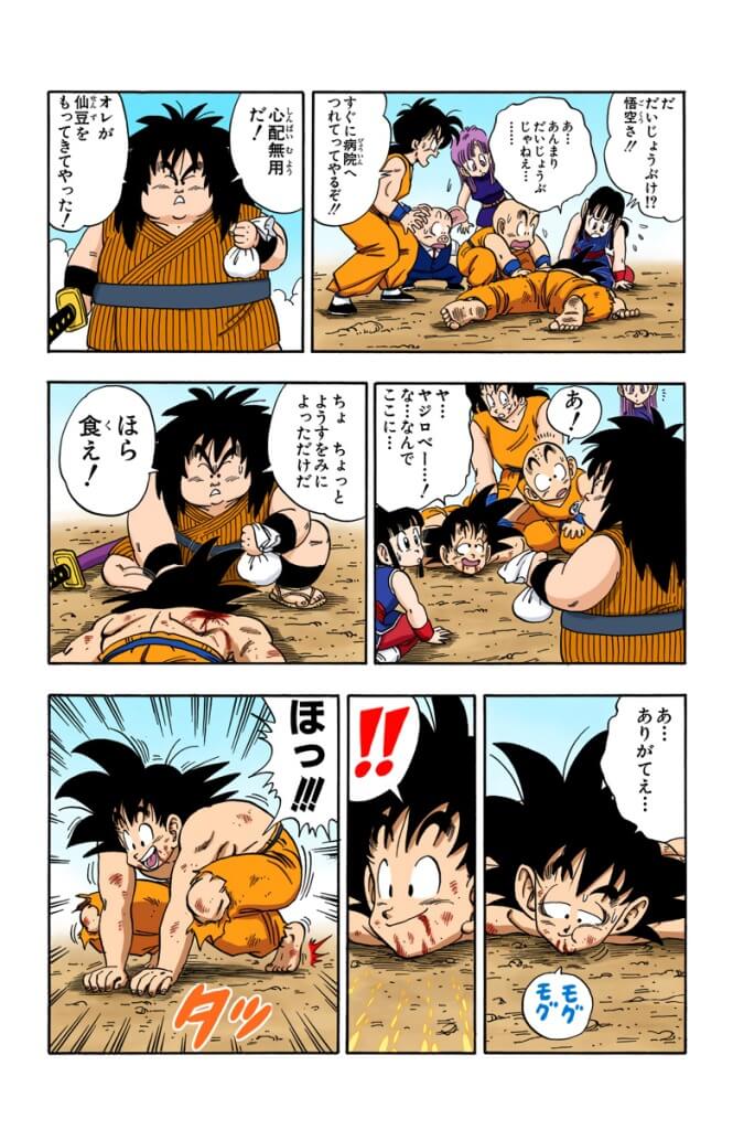 明確に食べた 描写はありません けれども ヤムチャのお腹の傷が塞がっています。マジュニア戦の悟空然り、欠損部にも効果があるのは本当にすごいですね!(古傷には効果ないようですが)