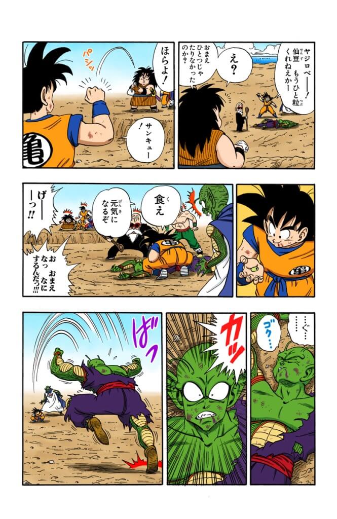 この頃からすっかりヤジロベーにとって代わり クリリンが仙豆の係になっちゃいましたね…そして戸惑うクリリンにピッコロが渡すように促すさりげない描写が地味に好きです