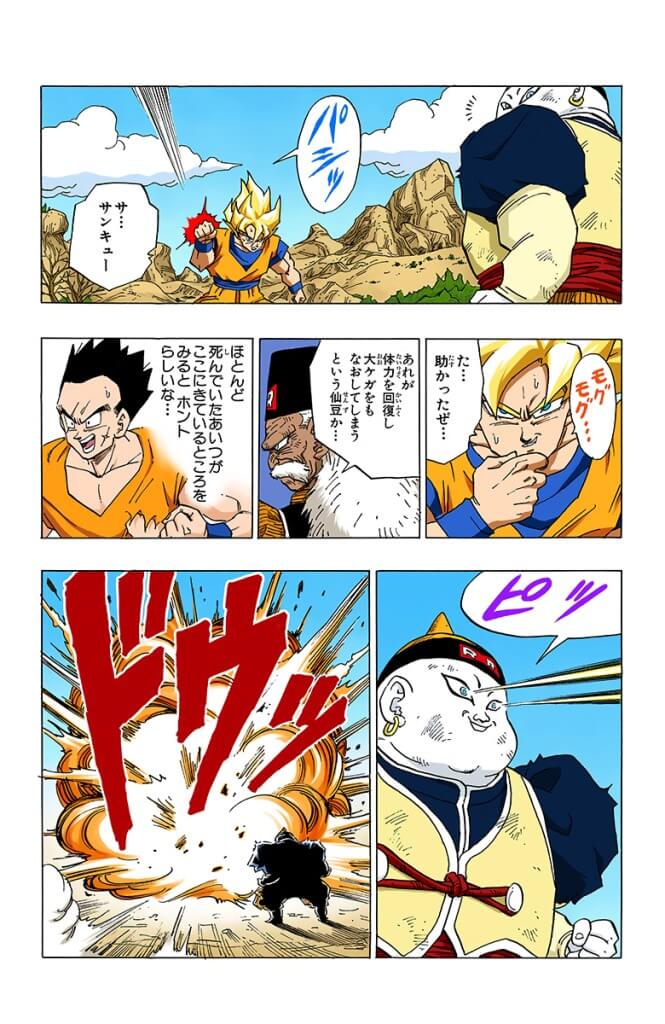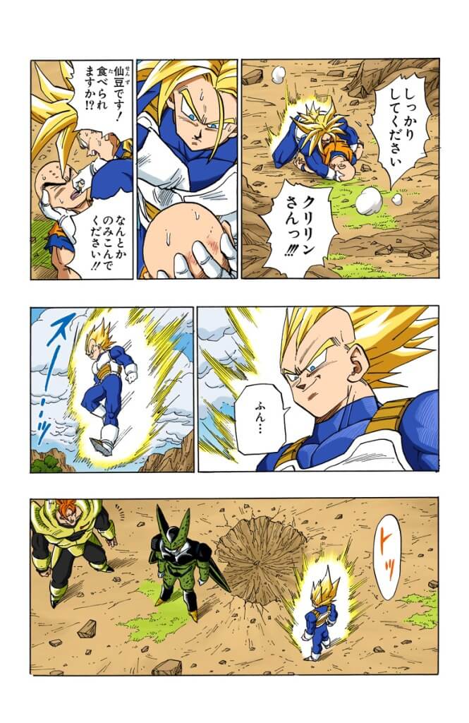 完全体のセル戦では「フェアじゃない!」と言ってたのに、ここでは遠慮なく食べています。それだけ余裕がないってことでしょう。