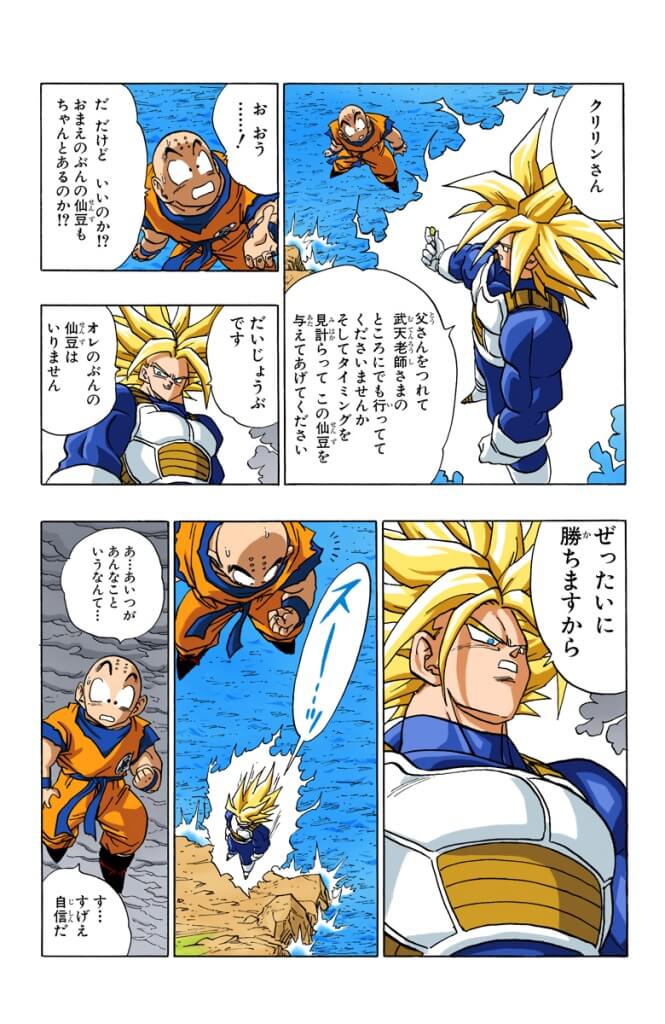 お次は場面はけっこう飛んで、完全体のセルにやられたクリリンに、トランクスが食べさせました