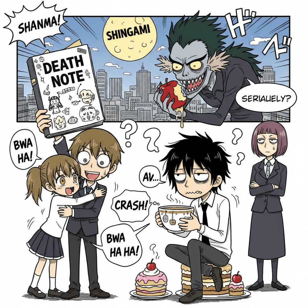 『DEATH NOTE』はシリアスな心理戦が魅力ですが、リュークのリンゴ愛やLの変な座り方には、どこか『ラッキーマン』のハチャメチャなユーモアが感じられます。